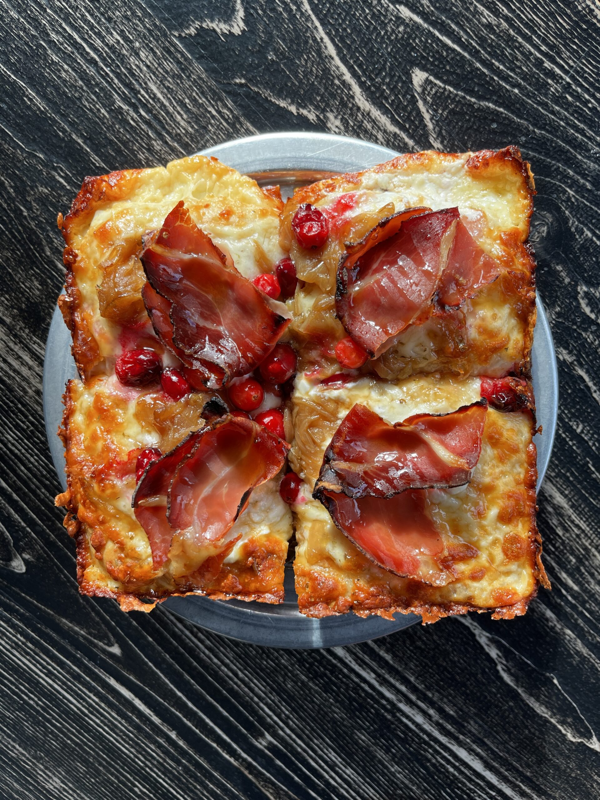 CM Cheese Blend, Speck, Caramelized Onions, Goat Cheese, Cranberries, Hot Honey
