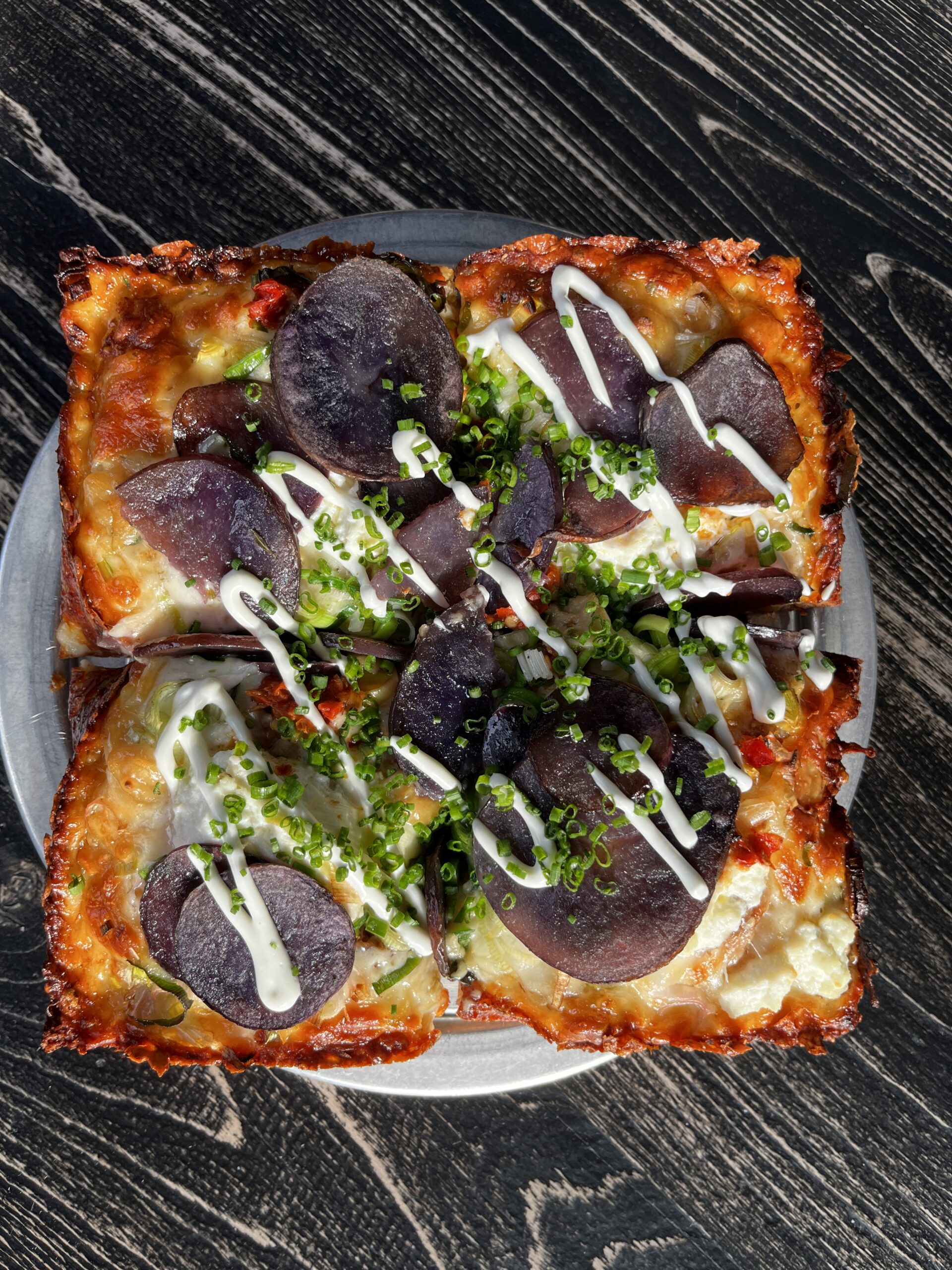 CM Cheese Blend, Ricotta, Calabrian Chili, Leeks, Confit Purple Potatoes, Roasted Garlic, Crème Fraîche, Chives