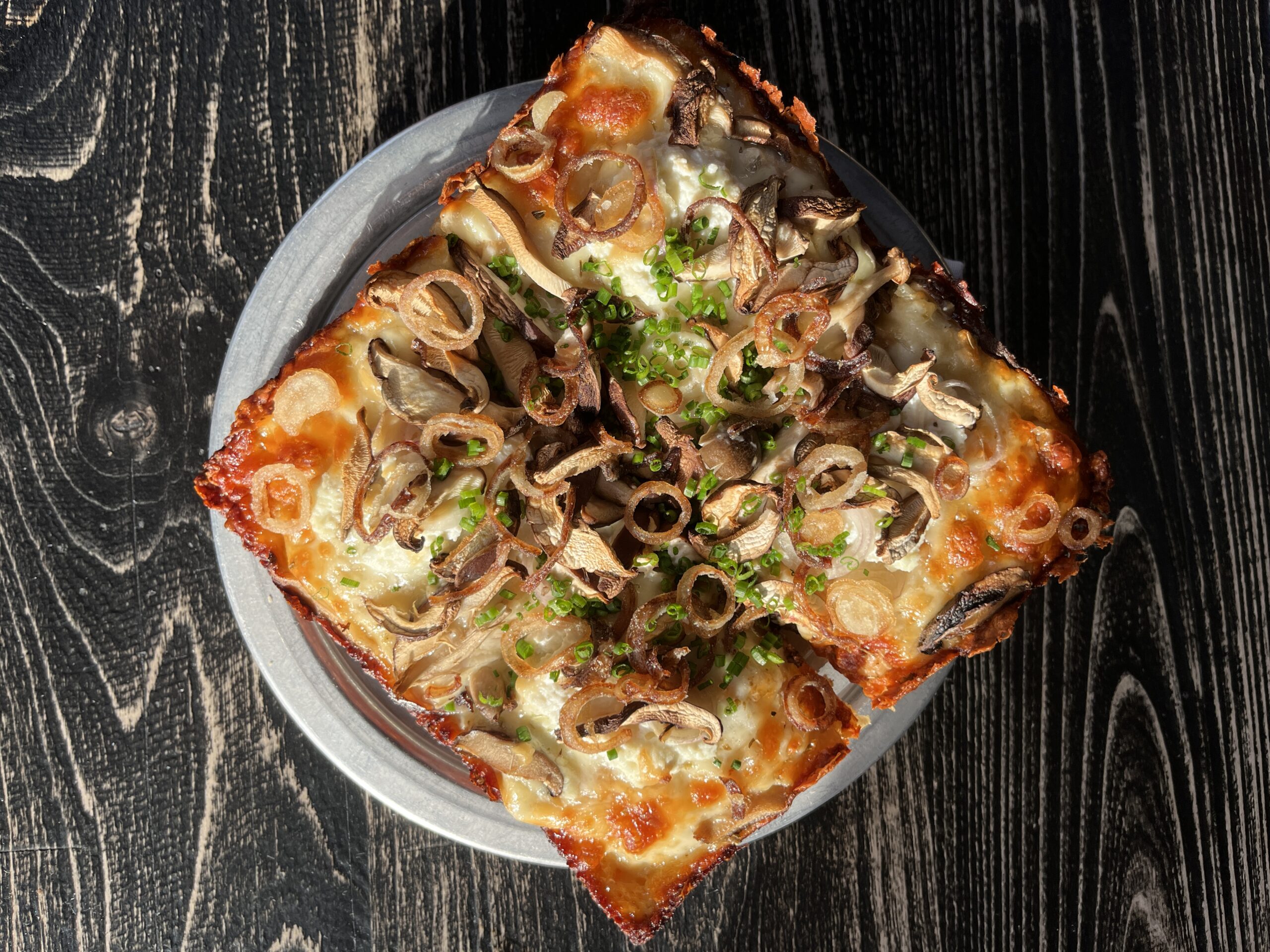 CM Cheese Blend, Ricotta, Shimeji, Crimini, Shitake Mushroom Blend, Shallots, Roasted Garlic Puree, Crispy Shallots, Chives