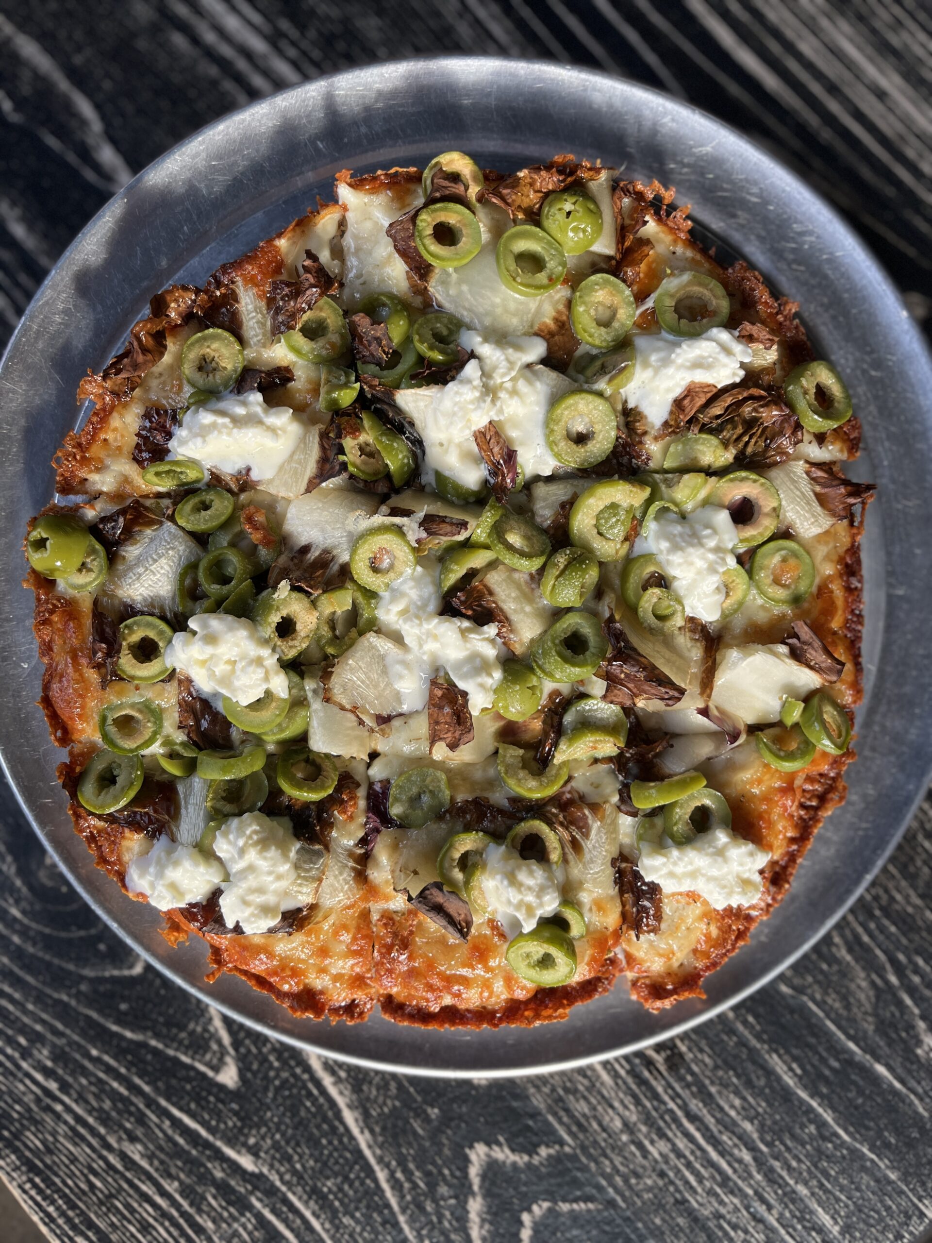 CM Cheese Blend, Oregano, Radicchio, Castelvetrano Olives, Roasted Garlic Purée, Pecorino, Stracciatella