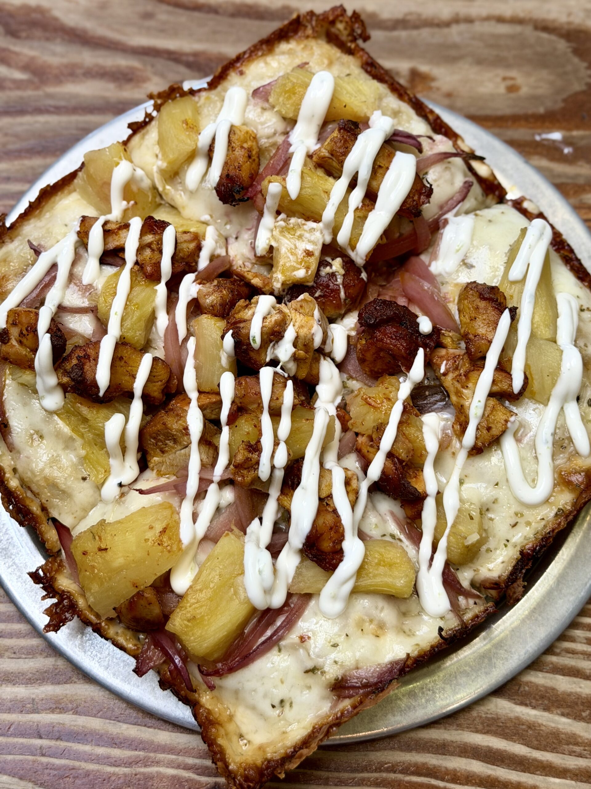 A Close-Up Of A Square Pizza Topped With Chunks Of Pineapple, Seasoned Chicken, Red Onions, Melted Cheese, And Drizzled With White Sauce, Served On A Round Metal Tray On A Wooden Table.