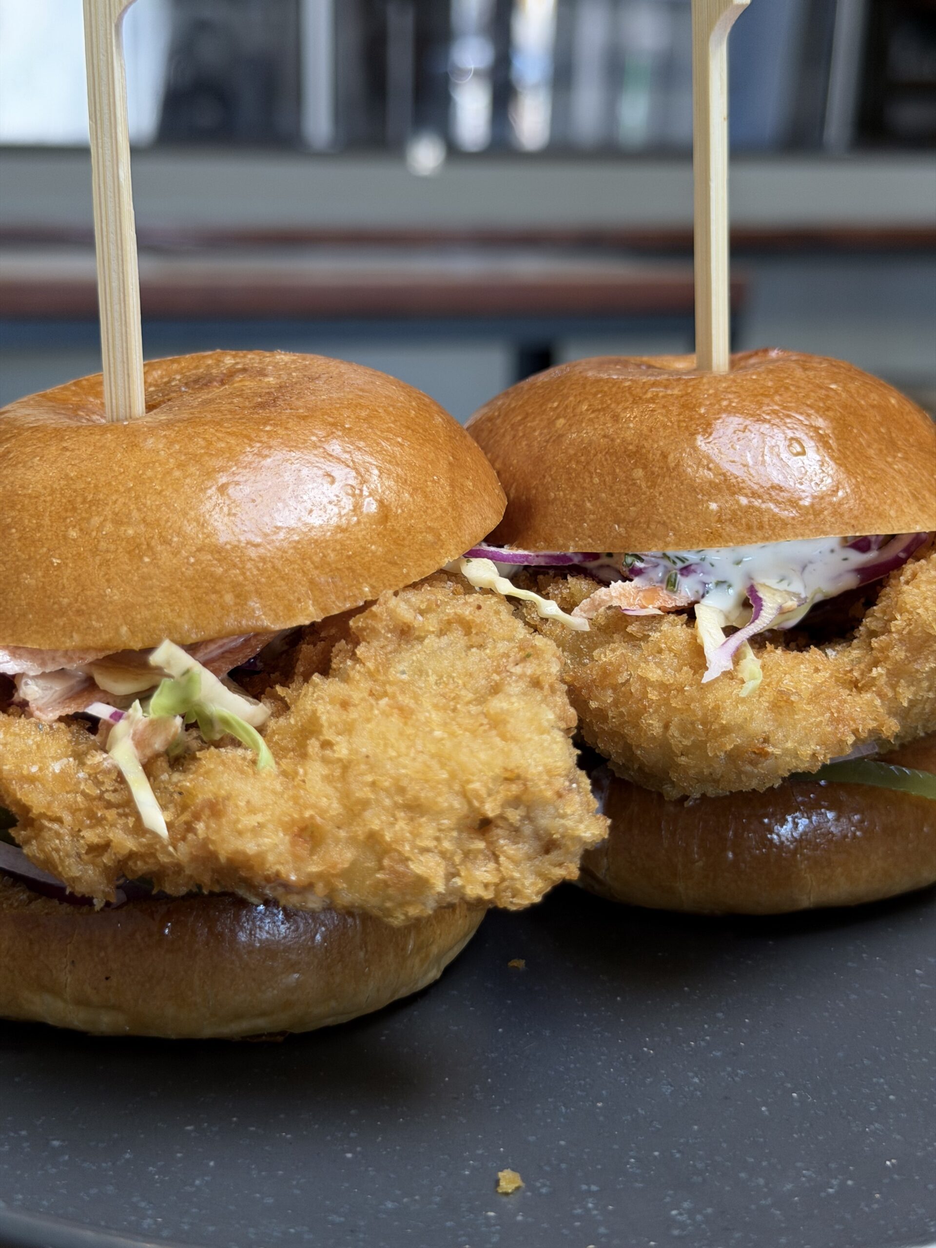 Two Fried Chicken Sandwiches With Coleslaw On Shiny Brioche Buns Are Placed Side By Side On A Dark Plate, Each Held Together With A Wooden Skewer.