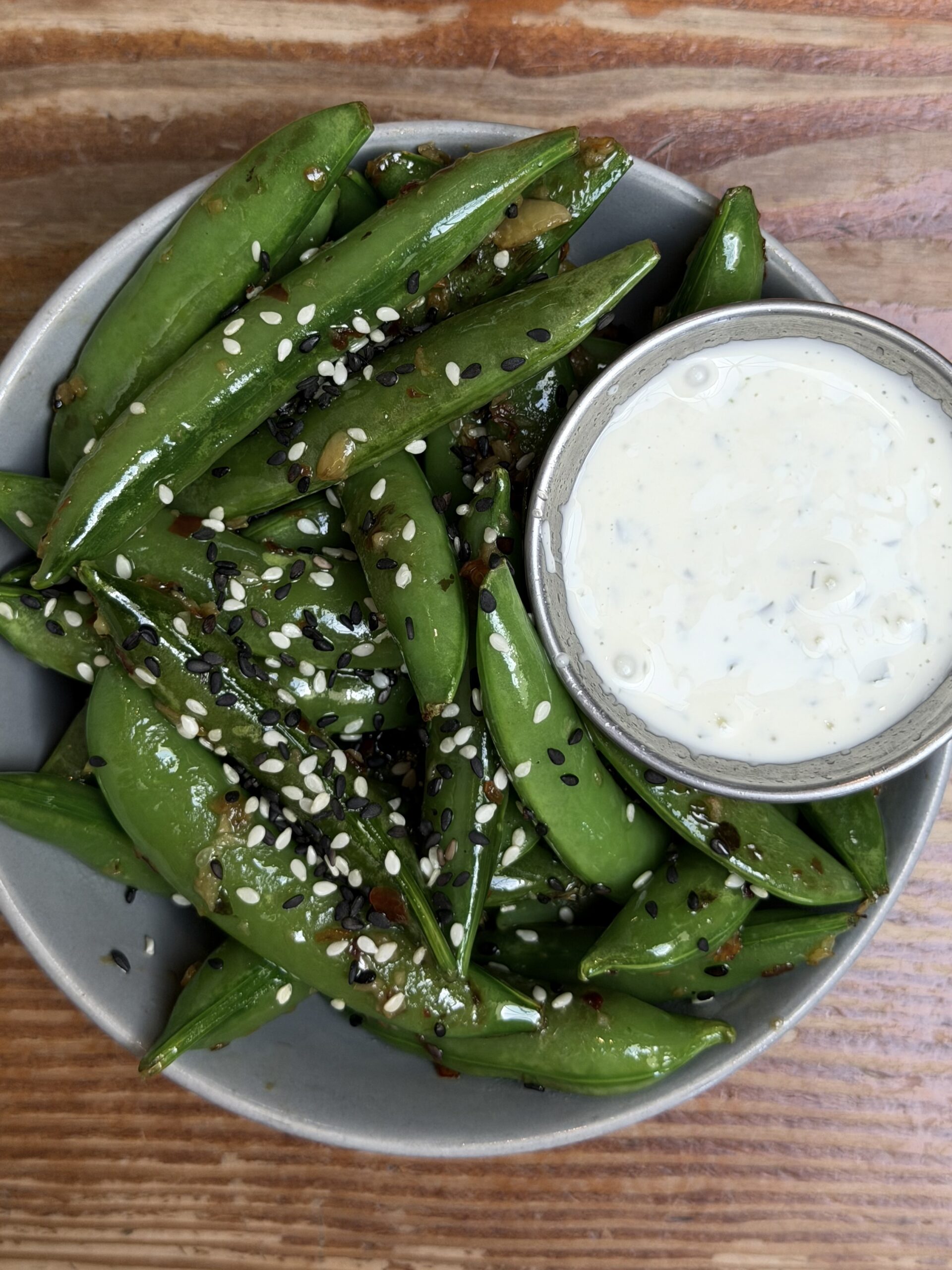 A Bowl Of Sautéed Sugar Snap Peas Topped With Black And White Sesame Seeds, Served With A Side Of Creamy White Dipping Sauce On A Wooden Table.