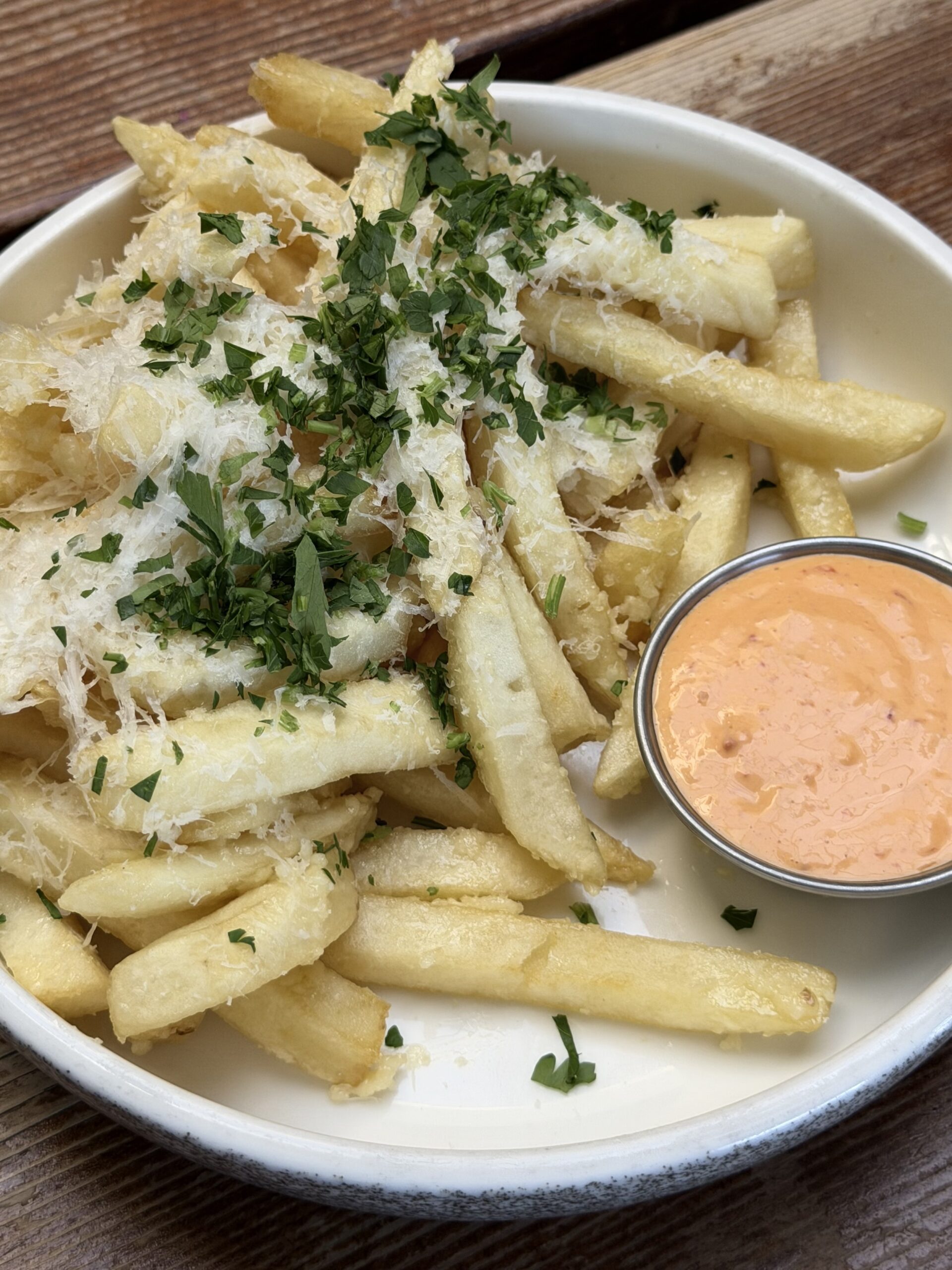 A Bowl Of French Fries Topped With Grated Cheese And Chopped Herbs, Served With A Small Metal Cup Of Orange Dipping Sauce On The Side, Placed On A Wooden Table.
