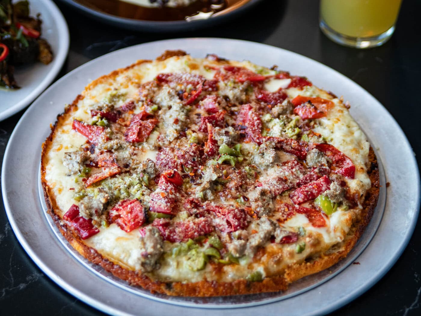 A Baked Pizza On A Metal Tray Topped With Sausage, Green Peppers, Red Peppers, And Melted Cheese, With A Plate Of Food And A Glass Of Yellow Drink In The Background.