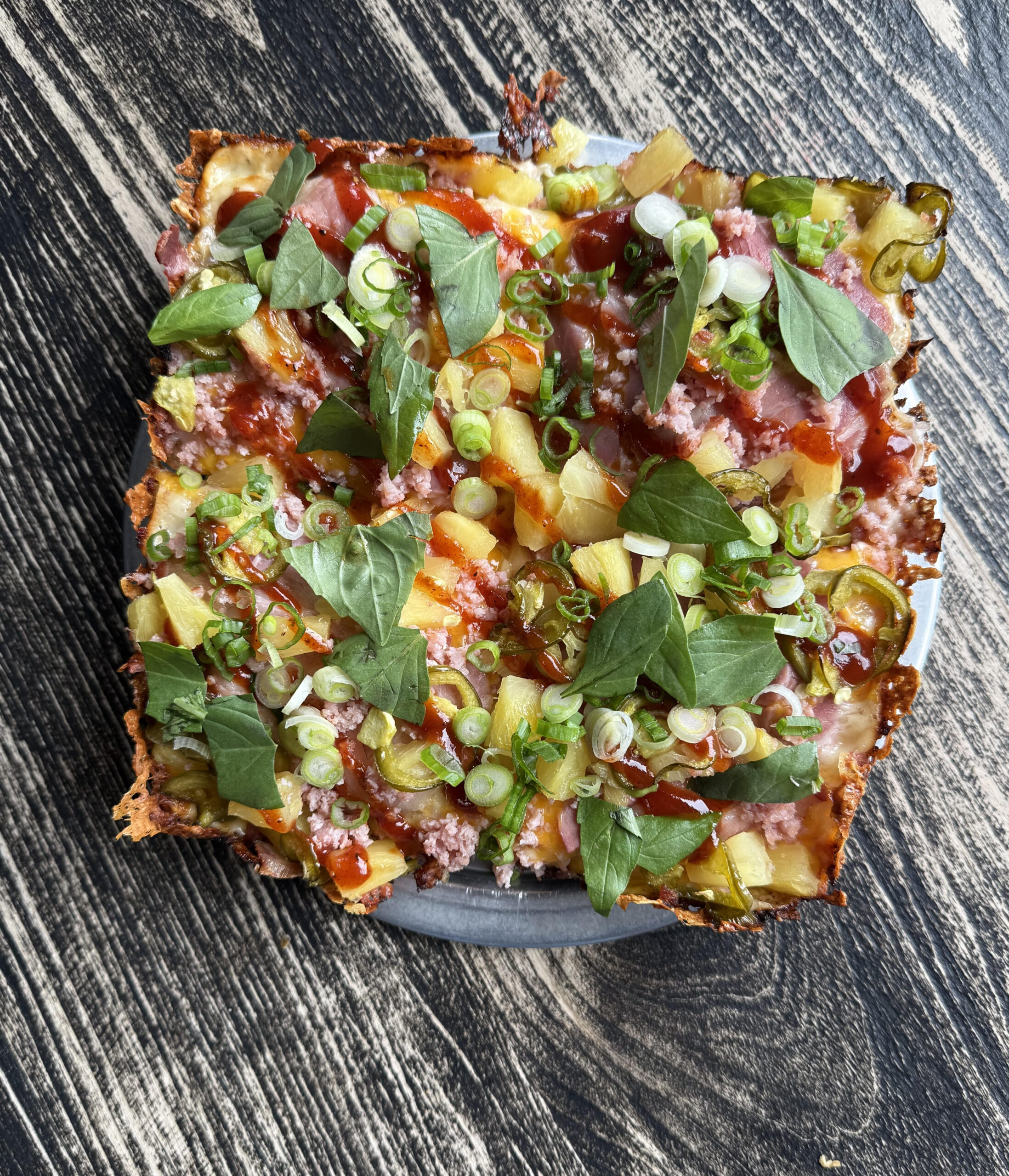 cm cheese blend, ham, bacon, pineapple, cheddar, pickled jalapeños, thai basil, scallions, hot honey, bbq sauce